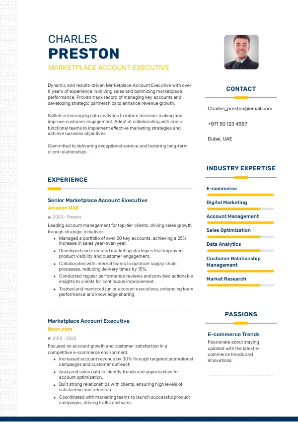 As the e-commerce landscape evolves, Marketplace Account Executives will take on more strategic roles, focusing on data-driven decision-making and customer relationship management. Responsibilities will include leveraging analytics tools to assess market trends and customer behavior, as well as collaborating with marketing teams to create targeted campaigns. Candidates should ensure their resumes reflect these evolving responsibilities, particularly in relation to new technologies.