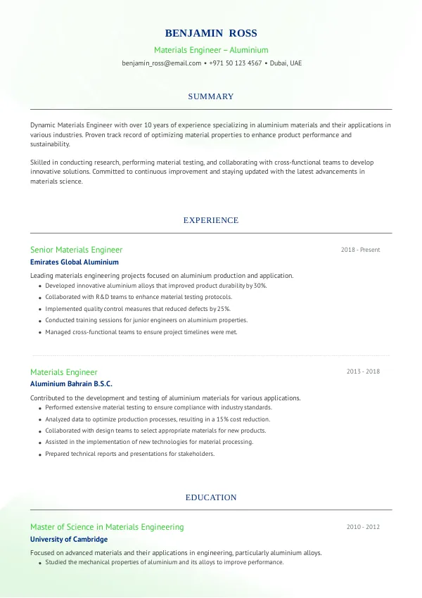 In 2026, the role of Materials Engineer specializing in Aluminium will expand significantly, focusing on sustainable manufacturing processes and advanced material properties. New terminologies such as 'Circular Economy' and 'Sustainable Design' will become integral to the role. A TrueCV-optimized resume will help candidates highlight their adaptability to these evolving expectations.