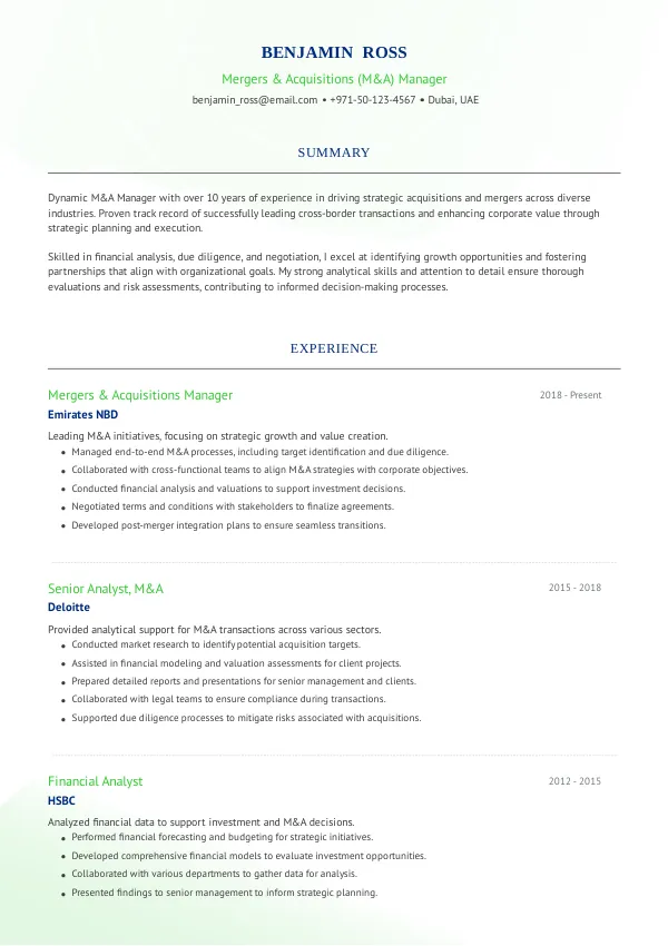 Position yourself for success in 2026 as a Mergers & Acquisitions Manager. Utilize TrueCV to enhance your resume, aligning with Golden Visa pathways and long-term residency opportunities.