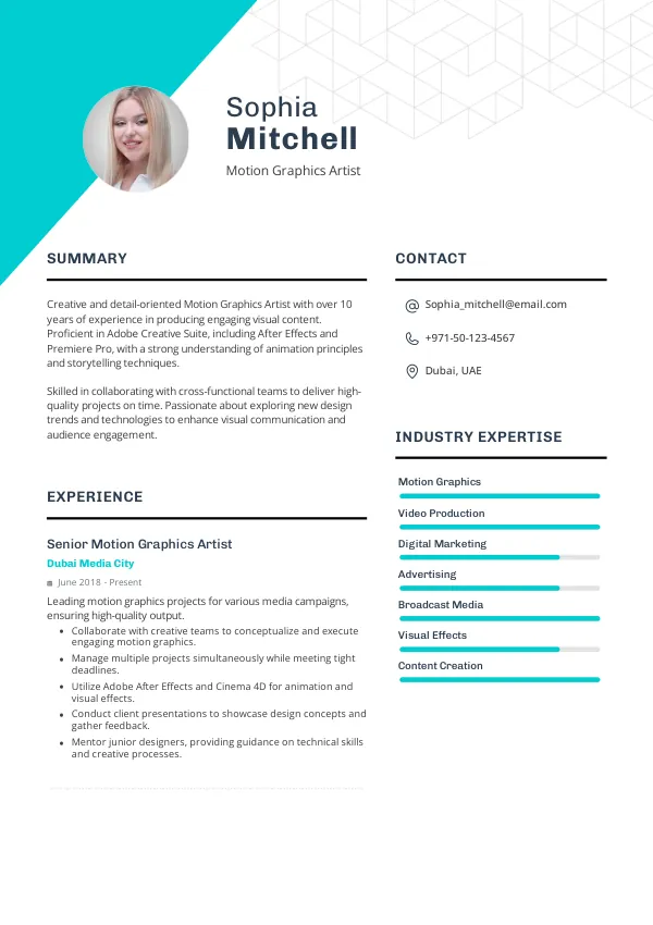 In 2026, the role of a Motion Graphics Artist in the UAE will expand significantly, driven by advancements in AI and augmented reality technologies. Artists will be expected to integrate immersive experiences into their designs, utilizing new tools like Adobe After Effects 2026 and Blender 3.5. As employers seek candidates who can adapt to these changes, a TrueCV-optimized resume will highlight your proficiency in these emerging technologies, positioning you as a top contender.