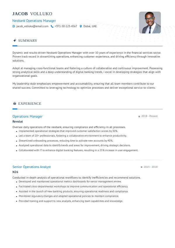 Resume Examples for Neobank Operations Managers