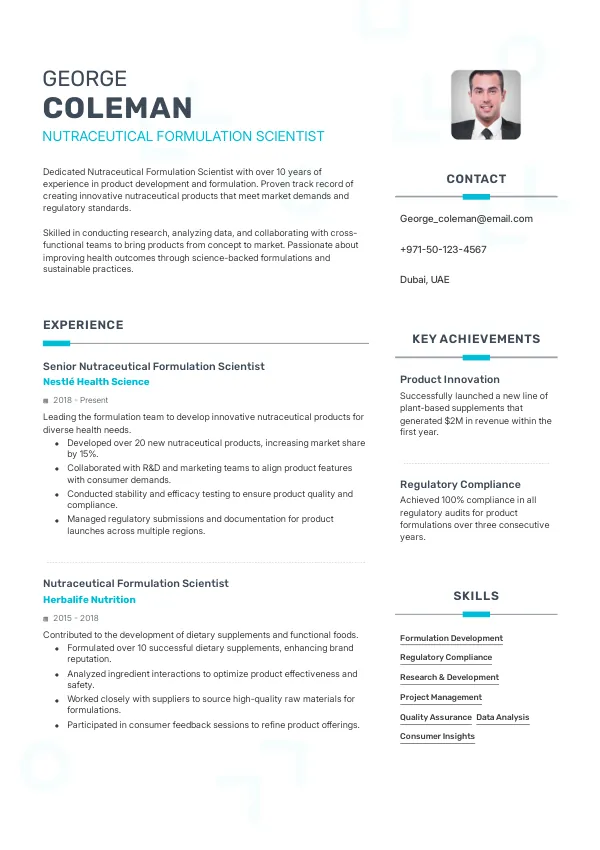 - Achievement: Successfully developed a new nutraceutical product line utilizing AI-driven formulation techniques, resulting in a 30% increase in market share.