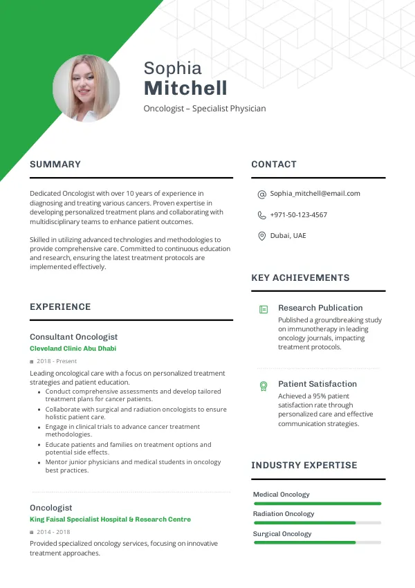 Leading healthcare institutions such as Cleveland Clinic Abu Dhabi, Mediclinic Middle East, and Abu Dhabi Health Services are ramping up their hiring of Oncologists in 2026. These employers are seeking candidates who can adapt to new technologies and treatment methodologies. A TrueCV-optimized resume will help you stand out to these top employers by aligning your skills with their needs.