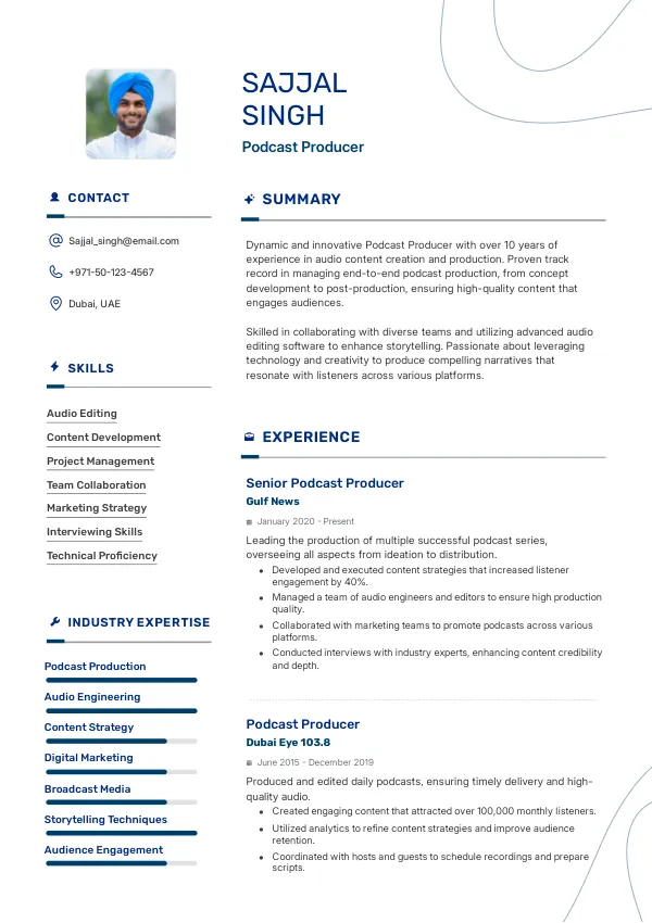 - Achievement: Developed a data-driven podcast series that increased audience engagement by 50%, demonstrating impact and contributing to long-term residency considerations, such as the Golden Visa.