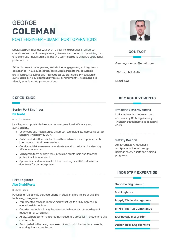 In 2026, the role of Port Engineer is evolving significantly due to advancements in Smart Port Operations technology, including automation and AI-driven logistics. This transformation not only enhances operational efficiency but also increases the demand for specialized engineers. A well-crafted resume that highlights your seniority and contributions can strengthen your profile for Golden Visa consideration.