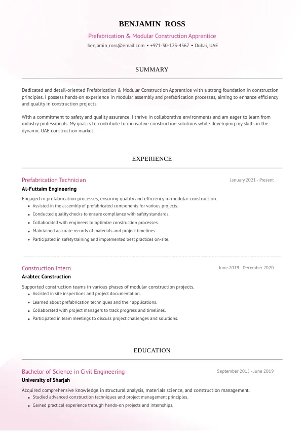 The UAE's ongoing investment in infrastructure and construction projects will provide strong career stability for Prefabrication & Modular Construction Apprentices in 2026. As companies seek to fill these roles, the demand for skilled workers will support visa opportunities for qualified candidates. A well-crafted resume that reflects the skills and experiences relevant to this role will be crucial for securing these opportunities, and TrueCV can assist in this process.