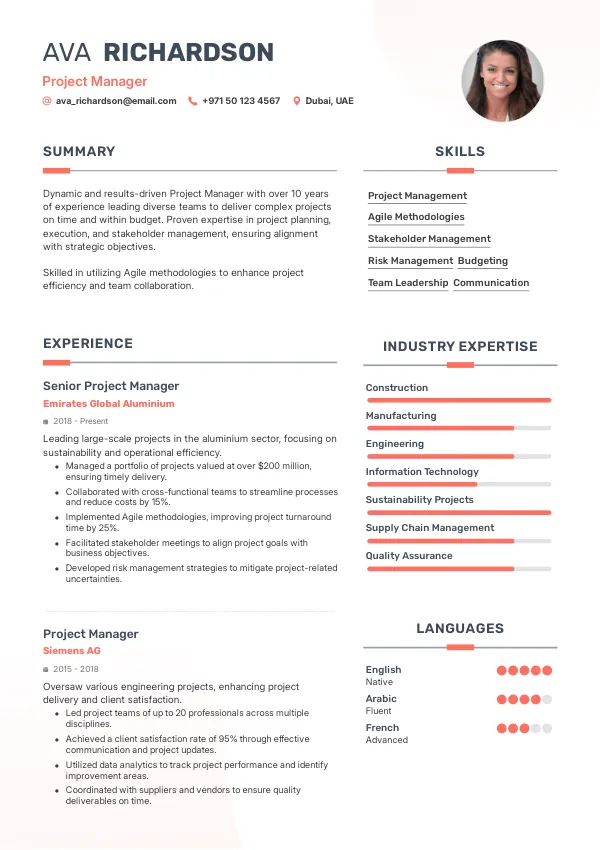 A successful Project Manager resume in the UAE should include relevant experience, skills in project management methodologies, and metrics that showcase your achievements.