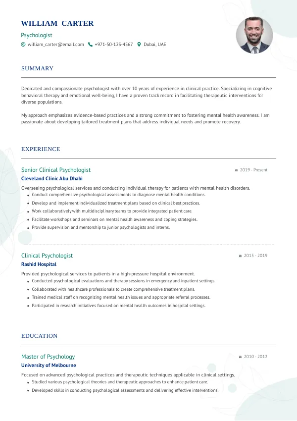 - Create UAE visa-compliant Psychologist resumes aligned with Green Visa requirements.