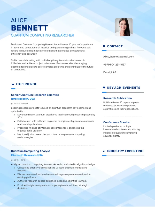 - Achievement: Developed a quantum algorithm that improved processing speed by 50%, demonstrating significant impact and aligning with long-term residency and Golden Visa considerations.