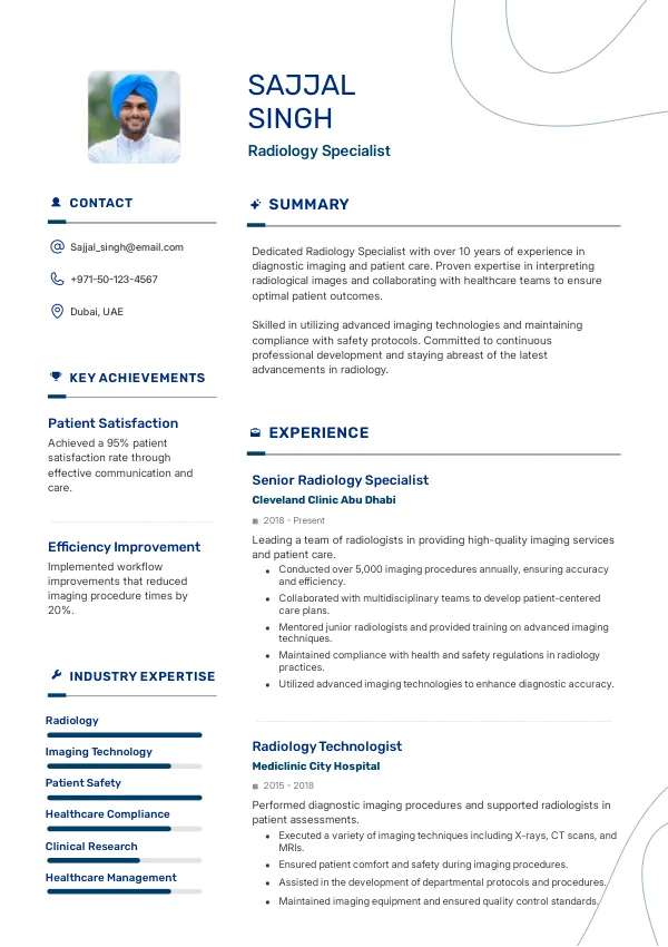 As a Radiology Specialist in 2026, your responsibilities will expand to include the interpretation of complex imaging results using AI-assisted tools, collaborating with multidisciplinary teams, and providing tele-radiology services. These evolving responsibilities not only enhance your professional stature but also signal your seniority to potential employers. A resume that effectively communicates these advanced responsibilities can improve your visibility in Golden Visa evaluations.
