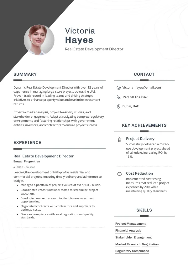 In 2026, the role of the Real Estate Development Director will significantly evolve, emphasizing sustainability and smart city initiatives. With the UAE's commitment to green building standards and urban innovation, this role will require a deep understanding of eco-friendly practices and advanced project management tools. A TrueCV-optimized resume will highlight your adaptability to these changes, making you a standout candidate.