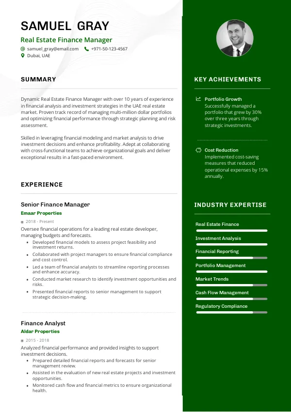 The role of a Real Estate Finance Manager in 2026 is evolving significantly, driven by advancements in financial technologies and regulatory frameworks. The integration of AI and blockchain in real estate transactions enhances transparency and efficiency, making this role more critical than ever. A well-crafted resume that highlights your seniority and contributions will resonate with employers and support Golden Visa consideration.