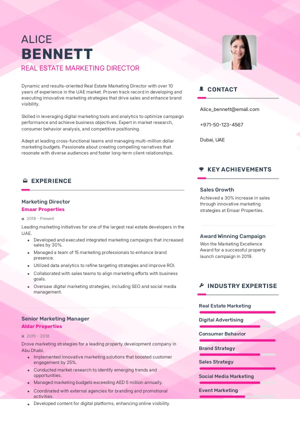Leading real estate firms such as Emaar Properties, Aldar Properties, and DAMAC Properties are ramping up their hiring of Real Estate Marketing Directors in 2026. These companies are looking for innovative leaders who can leverage new marketing technologies to enhance their brand presence and drive sales. A TrueCV-optimized resume can help you align your skills with the specific needs of these top employers.