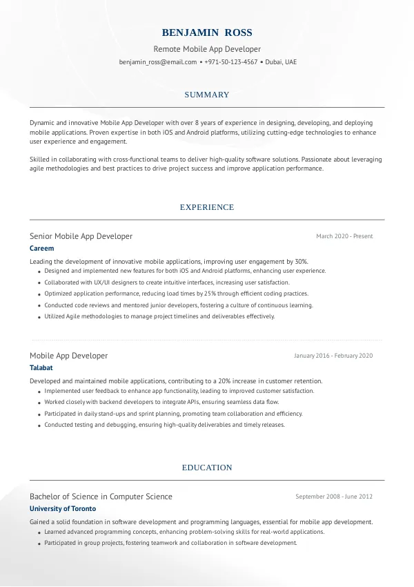- Achievement: Successfully developed a cross-platform mobile application that increased user engagement by 30%.