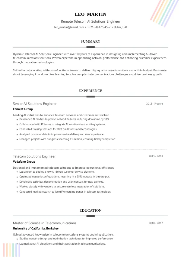 As the telecommunications landscape evolves, a TrueCV-optimized resume will position you for success as a Remote Telecom AI Solutions Engineer. Stay ahead of the curve and align your skills with the future of the industry.