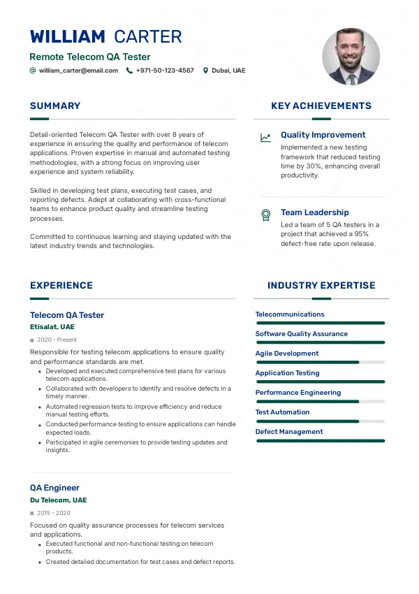 The UAE's commitment to becoming a global tech hub will ensure a stable job market for Remote Telecom QA Testers. As companies expand their operations and invest in new technologies, the demand for skilled professionals will remain strong, providing job security and growth opportunities. A TrueCV-optimized resume can help you navigate the competitive landscape and secure your position in this thriving market.
