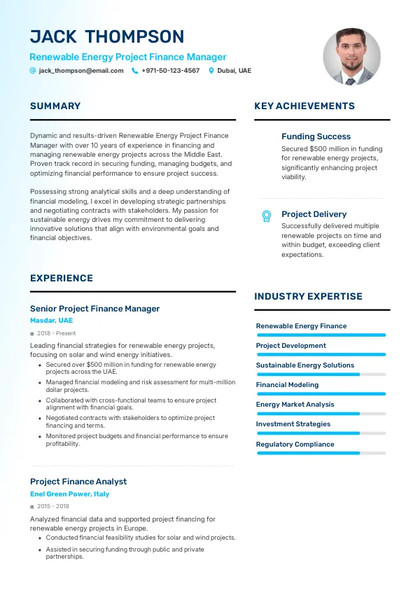 Position yourself for success as a Renewable Energy Project Finance Manager in 2026. Let TrueCV help you craft a resume that reflects your seniority and aligns with Golden Visa pathways for long-term residency.