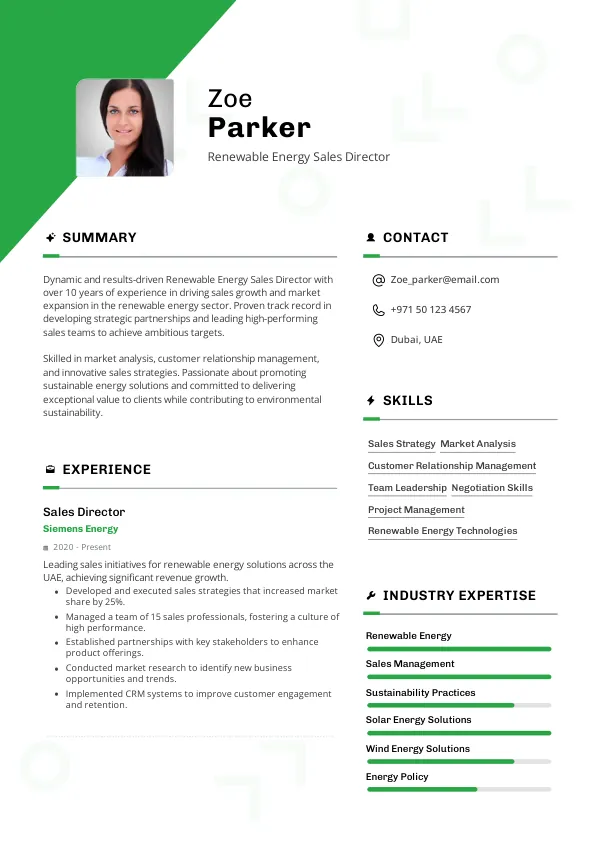 Top companies in the renewable energy sector, such as Masdar, First Solar, and Siemens Gamesa, are ramping up their hiring efforts for Renewable Energy Sales Directors to meet the growing market demand. These employers are looking for candidates who can drive sales and foster partnerships in a rapidly evolving industry. A TrueCV-optimized resume can help you align your experiences with the specific needs of these companies.