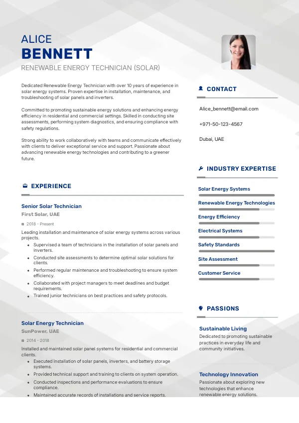 In 2026, the role of Renewable Energy Technicians (Solar) will significantly evolve, focusing on advanced solar technologies such as bifacial solar panels and energy storage systems. As the UAE pushes for sustainability, technicians will need to adapt to new installation techniques and maintenance protocols. A TrueCV-optimized resume will highlight your adaptability and technical skills, aligning with the industry's evolving expectations.