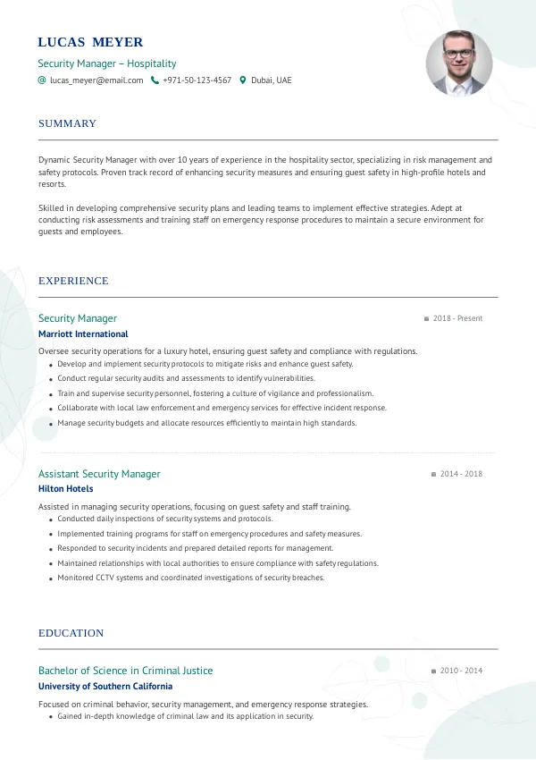 The hospitality sector in the UAE is projected to grow, leading to increased job stability for Security Managers. As international tourism rebounds, employers will seek qualified professionals to ensure safety and compliance. A TrueCV-optimized resume can help you navigate visa applications by clearly demonstrating your qualifications and experience.