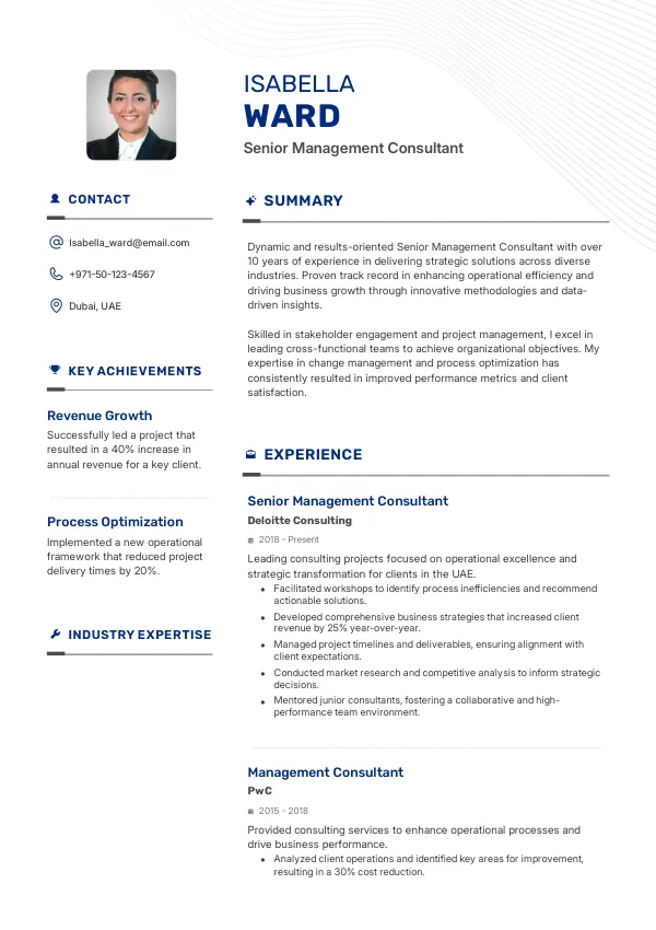 In 2026, the role of a Senior Management Consultant is evolving significantly due to advancements in data analytics and AI-driven decision-making tools. These technologies enhance strategic insights, making the role more impactful and specialized. As a result, positioning your resume to reflect these evolving expectations is crucial for signaling seniority and economic contribution, which supports Golden Visa consideration.