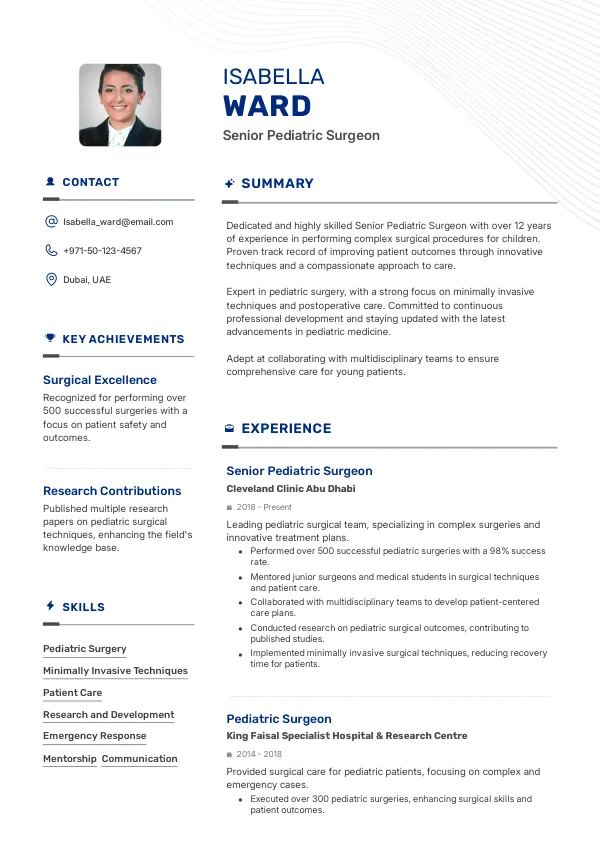 Position yourself for success as a Senior Pediatric Surgeon with TrueCV. Enhance your resume to reflect your seniority and contributions, aligning with Golden Visa opportunities for long-term residency.