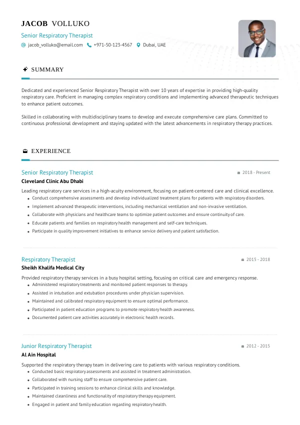Major healthcare providers in the UAE, such as Cleveland Clinic Abu Dhabi, Mediclinic, and NMC Healthcare, are actively seeking Senior Respiratory Therapists. Their commitment to advanced respiratory care signals a stable employment landscape, which is beneficial for long-term residency and Golden Visa considerations. A well-positioned resume through TrueCV can enhance your visibility to these employers.