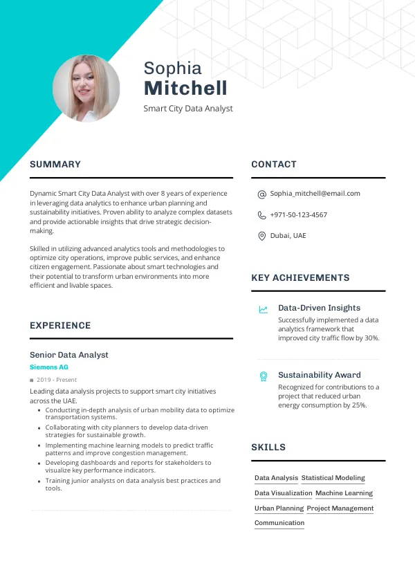 The UAE's commitment to becoming a global leader in smart city initiatives will provide strong career stability for Smart City Data Analysts. The demand for skilled professionals in this field will ensure continuous hiring opportunities. A well-crafted TrueCV resume can position you favorably in this stable job market.