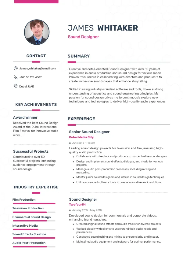 In 2026, the role of Sound Designer will expand significantly, incorporating immersive audio technologies such as spatial audio and AI-driven sound synthesis. As the creative arts industry in the UAE embraces these advancements, Sound Designers will be expected to not only create soundscapes but also integrate with interactive media platforms. A TrueCV-optimized resume will help highlight your adaptability to these new technologies and your readiness for this evolving role.