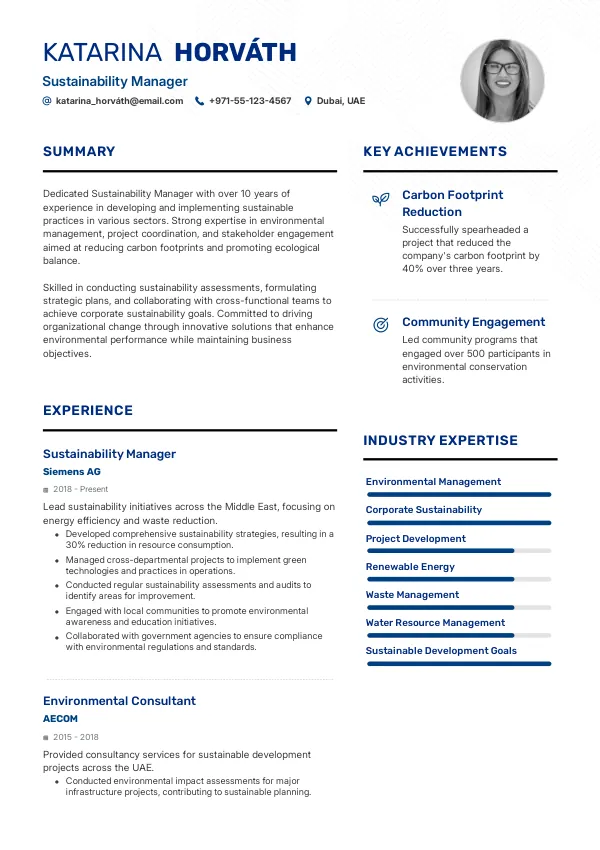 - Create UAE visa-compliant CV & Resume tailored to the Sustainability Manager role.