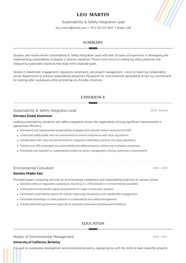 - Achievement: Successfully integrated sustainability metrics into safety protocols, resulting in a 30% reduction in workplace incidents.