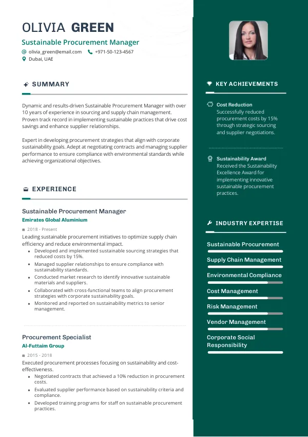 The demand for Sustainable Procurement Managers in the UAE is expected to create stable career opportunities, particularly for those with expertise in sustainability and compliance. As companies expand their sustainability initiatives, the need for skilled professionals will continue to grow, providing a favorable job market. A TrueCV-optimized resume can enhance your visibility to employers, increasing your chances of securing a stable position in this thriving field.