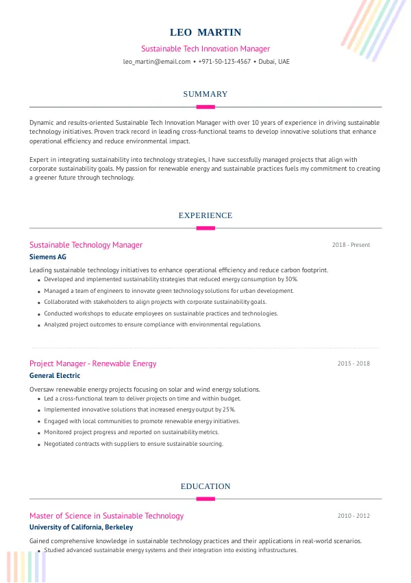 - Achievement: Successfully led a project integrating AI-driven sustainability solutions, resulting in a 30% reduction in energy consumption.
