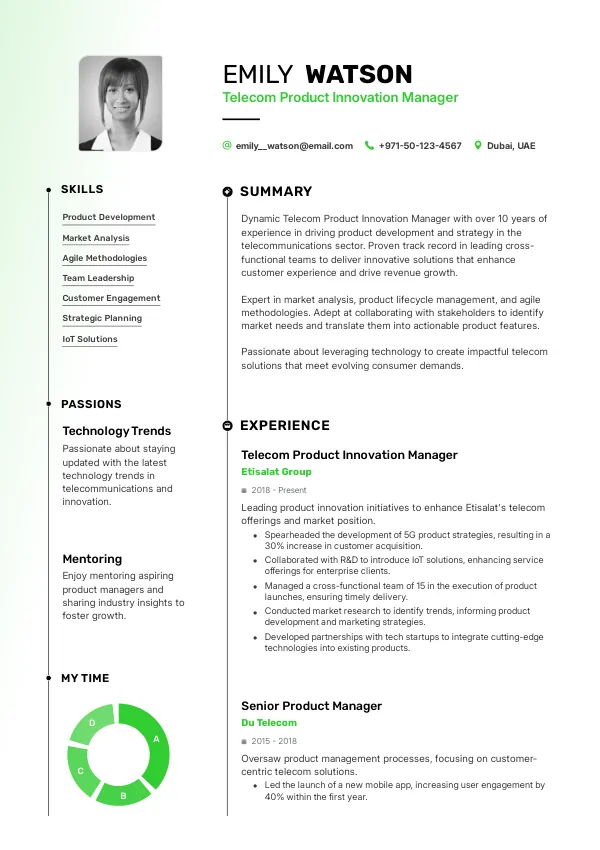 The UAE's commitment to becoming a global tech hub enhances career stability for Telecom Product Innovation Managers. As companies expand their operations, the demand for skilled professionals will remain strong, providing ample opportunities for career advancement. A TrueCV-optimized resume will help candidates navigate the competitive job market and secure desirable positions.