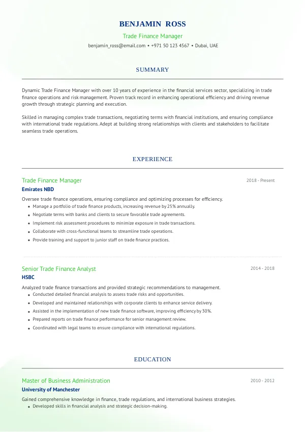 - Keyword mapping ensures your resume meets ATS requirements for Trade Finance Manager roles.