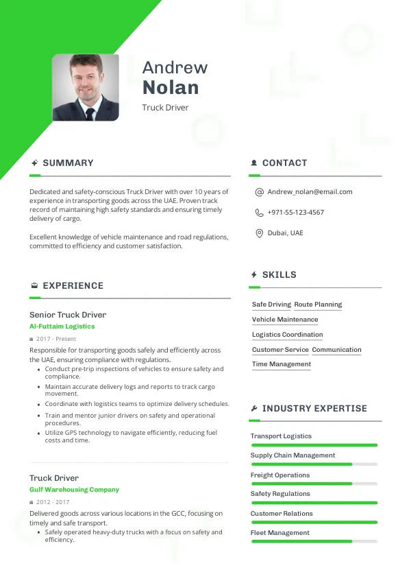 However, standing out in this competitive job market requires a professional CV & Resume that highlights your skills and experiences effectively. At Truecv, we specialize in creating tailored resumes that cater specifically to Truck Drivers in the UAE.