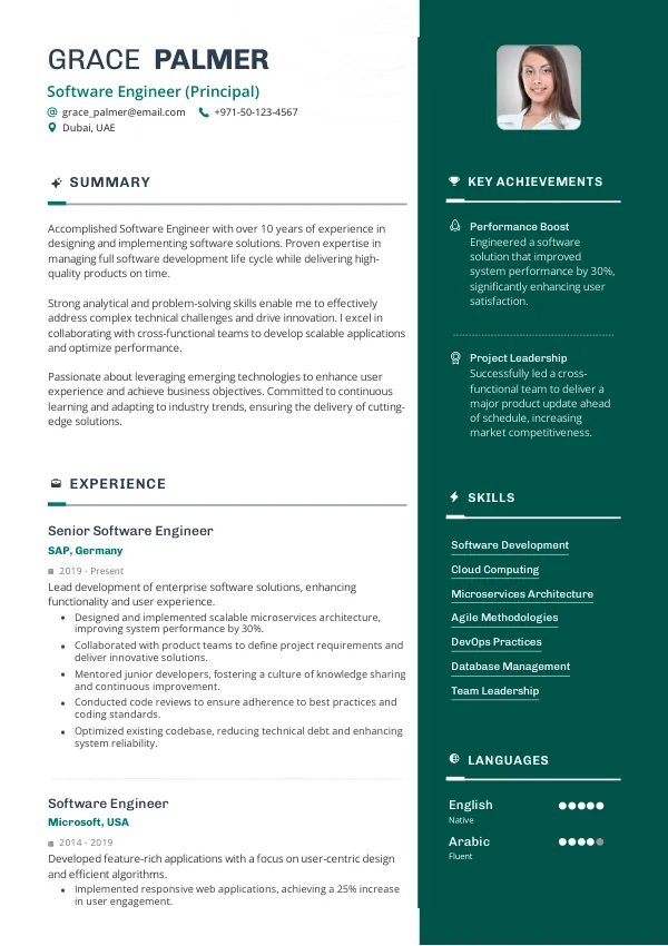 Don't miss your chance to secure a promising career in the UAE. Start your journey with a Truecv-optimized Software Engineer (Principal) – UAE Golden Visa Resume!