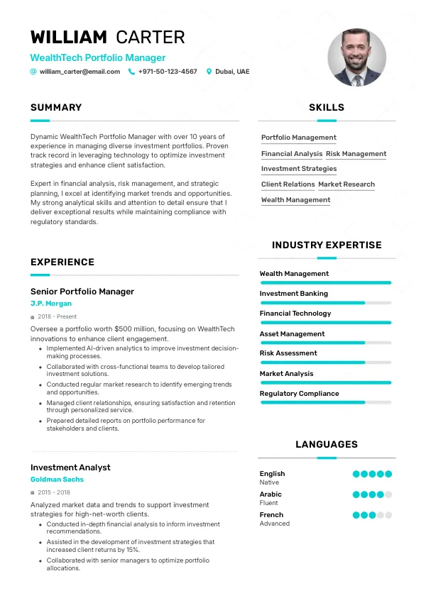 As the role of WealthTech Portfolio Manager evolves, responsibilities will expand to include the integration of advanced analytics and client relationship management systems. In 2026, these professionals will be expected to not only manage portfolios but also to utilize predictive analytics to forecast market trends and client needs. This shift necessitates a focus on continuous learning and adaptation, which can be effectively communicated through a TrueCV-optimized resume.